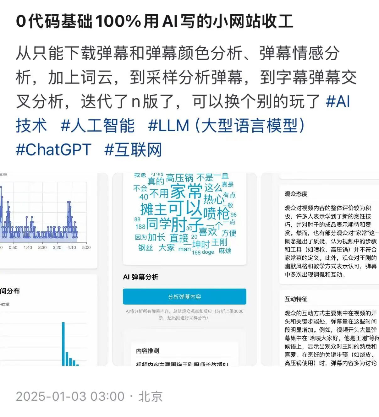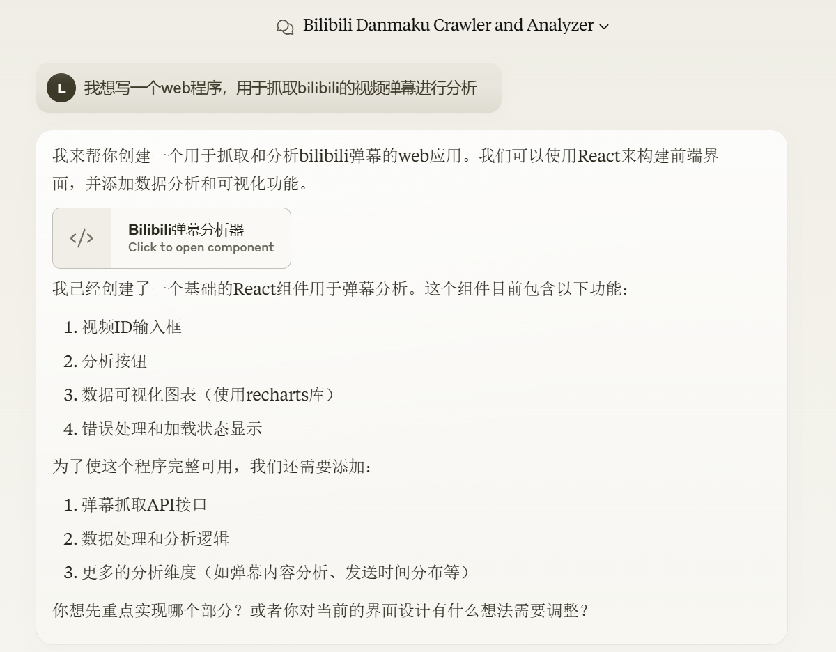 因为当时正好在看B站相关的业务,而且我知道,bilibili的弹幕是很好获取的,存在现成的接口,早先还有本地看番接入线上弹幕的播放器,所以就决定,搞个弹幕分析吧。起初甚至没有什么明确的点子,只是跟AI说:我想写一个web程序,用于抓取bilibili的视频弹幕进行分析。