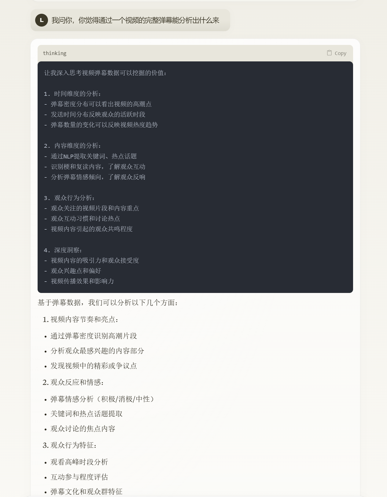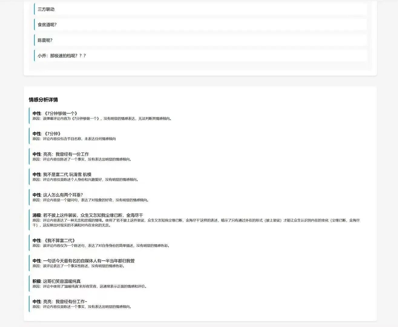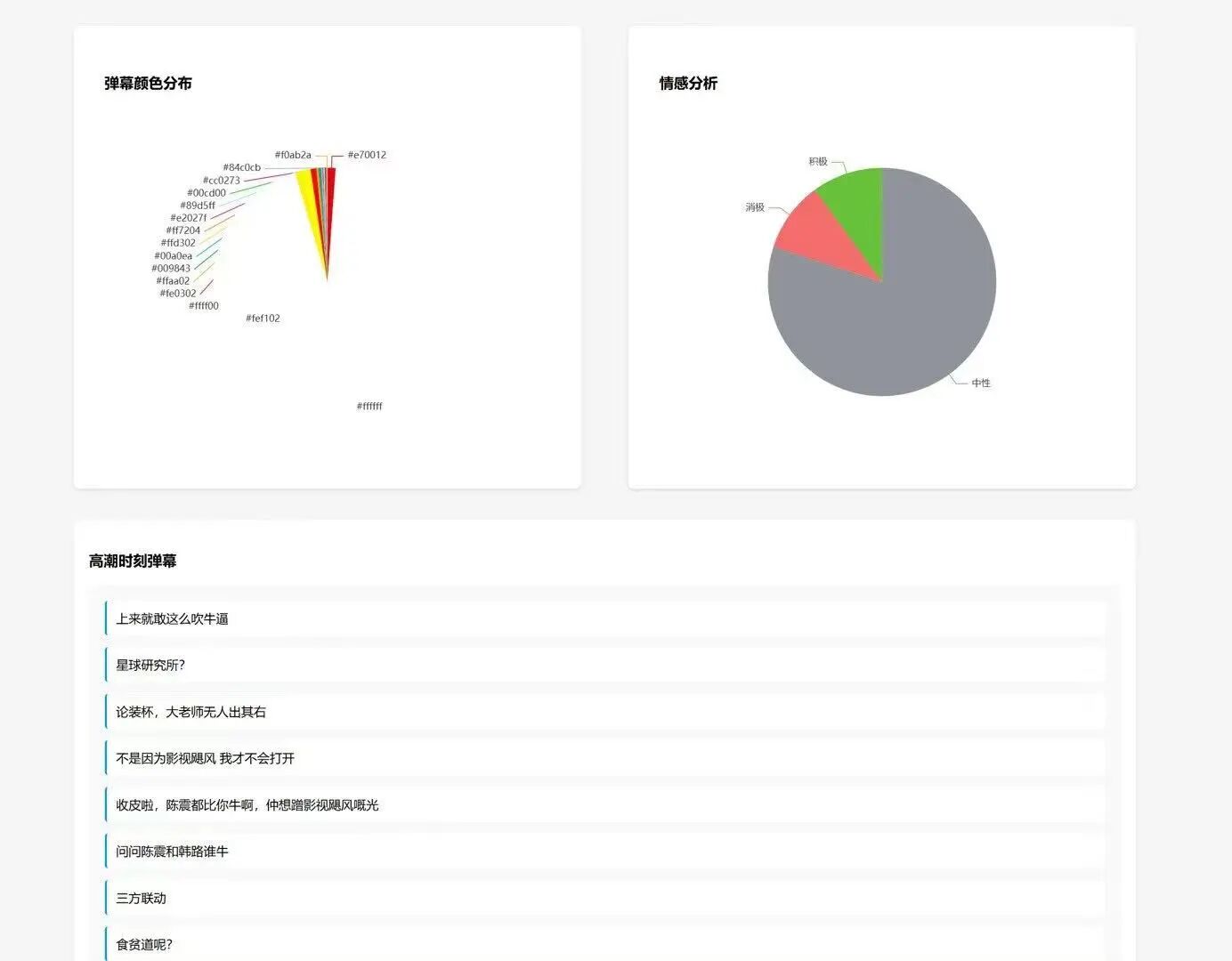 大部分的分析是根据获取到了什么信息就地分析的,例如说弹幕颜色,然后,按照AI自己的思路,展示了高能时刻弹幕的抽样,以及10条典型弹幕的情感分析。