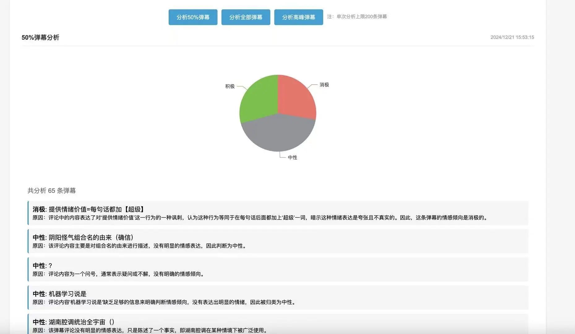 而后就可以继续迭代,比如下面是其中的一个中间版本,我继续调整了布局,并觉得采样10条弹幕进行情感分析不合理,增加了三种分析模式:分析全部、分析高峰、分析50%采样。
