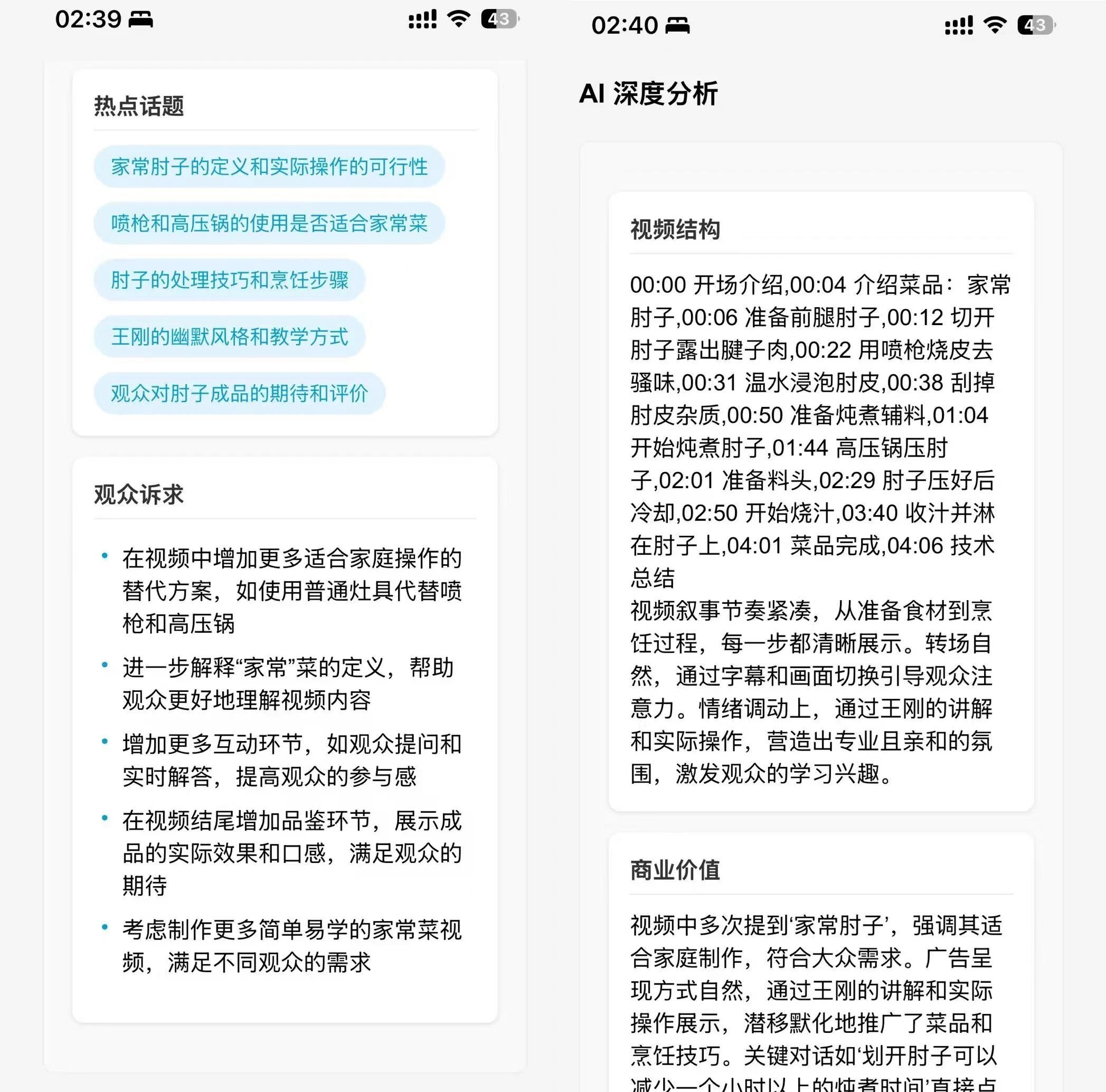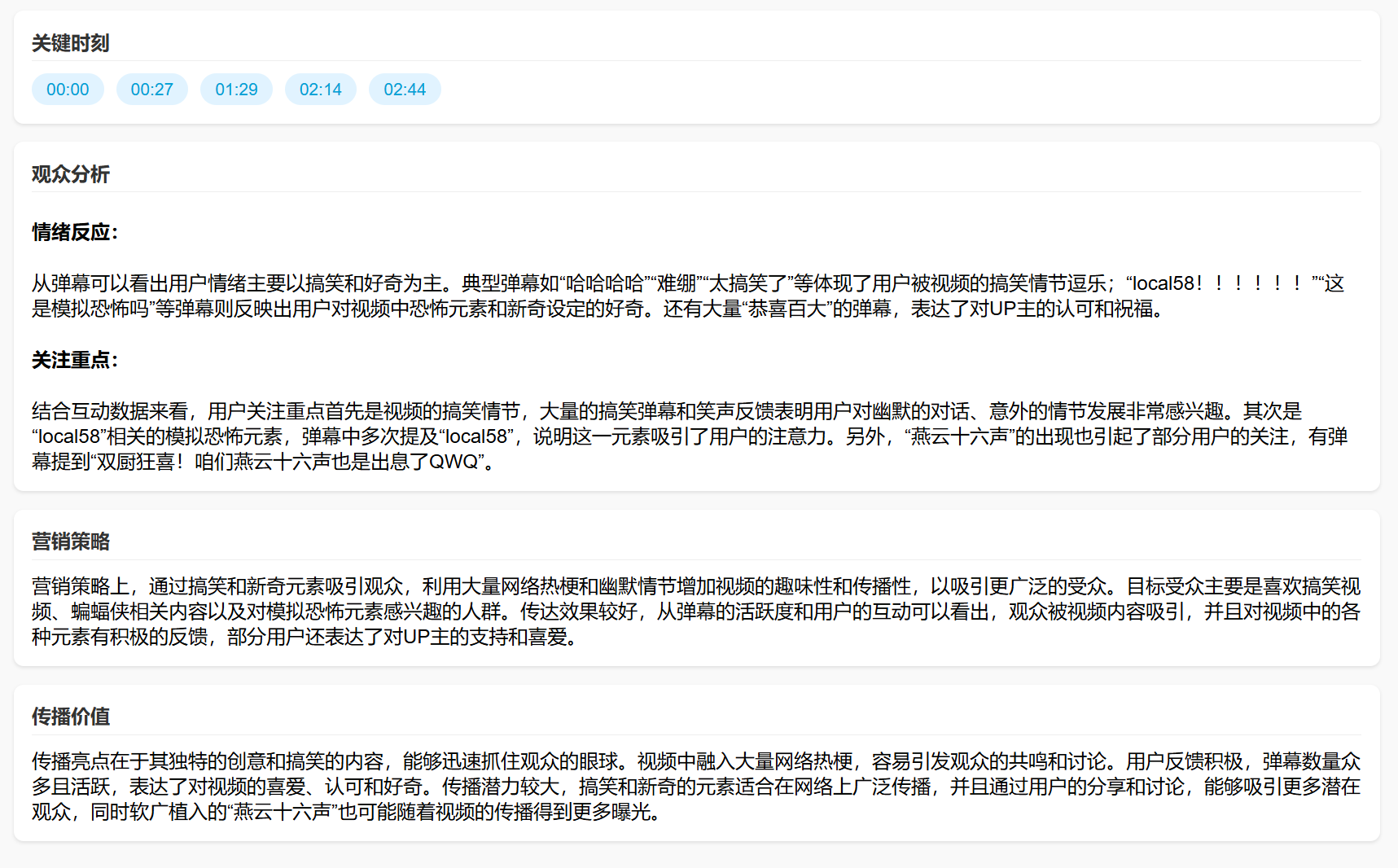 接下来就是字幕和弹幕交叉分析的部分,AI会结合弹幕高峰时刻的弹幕内容和字幕中体现出的故事情节进行比对分析,洞察观众的情绪反应和关注点,并且分析视频的营销策略和传播价值。