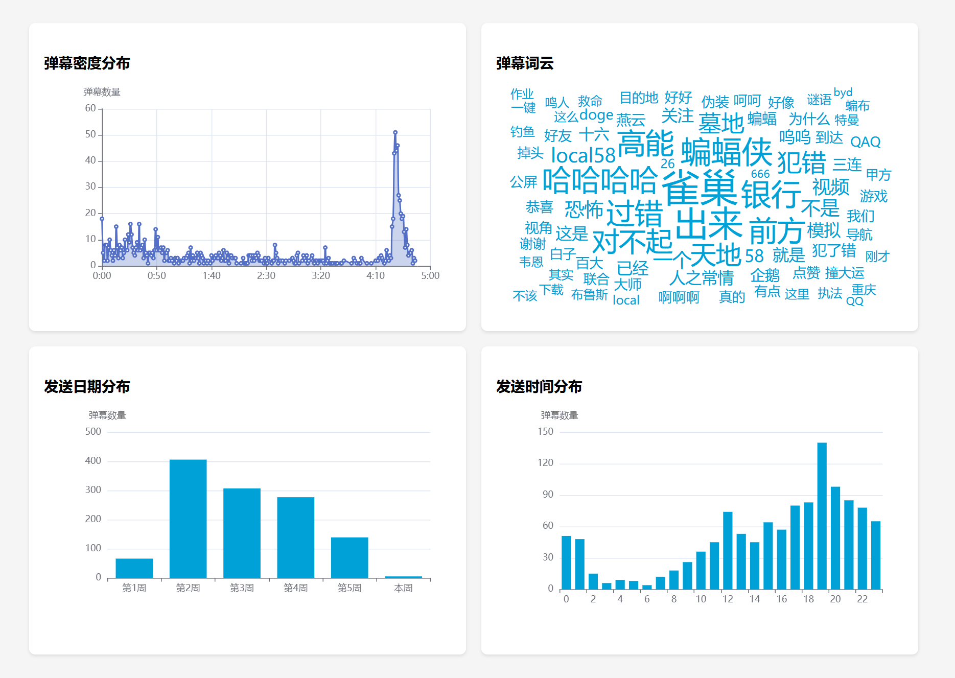 发布时间分布则是统计了发出弹幕的自然时刻(0点-24点),一定程度可以反映该领域或者该类型视频观众的活跃时间。但对于大UP主,会收到视频发布时间的干扰,据我观察,一定体量以上的UP主的视频弹幕发送时间,会集中在视频发布后的几个小时。如果你需要进行客观分析,我建议你下载后手动去除一下视频发布首日的弹幕。