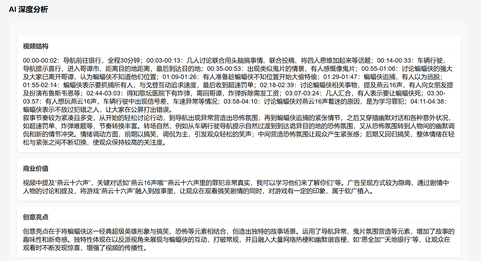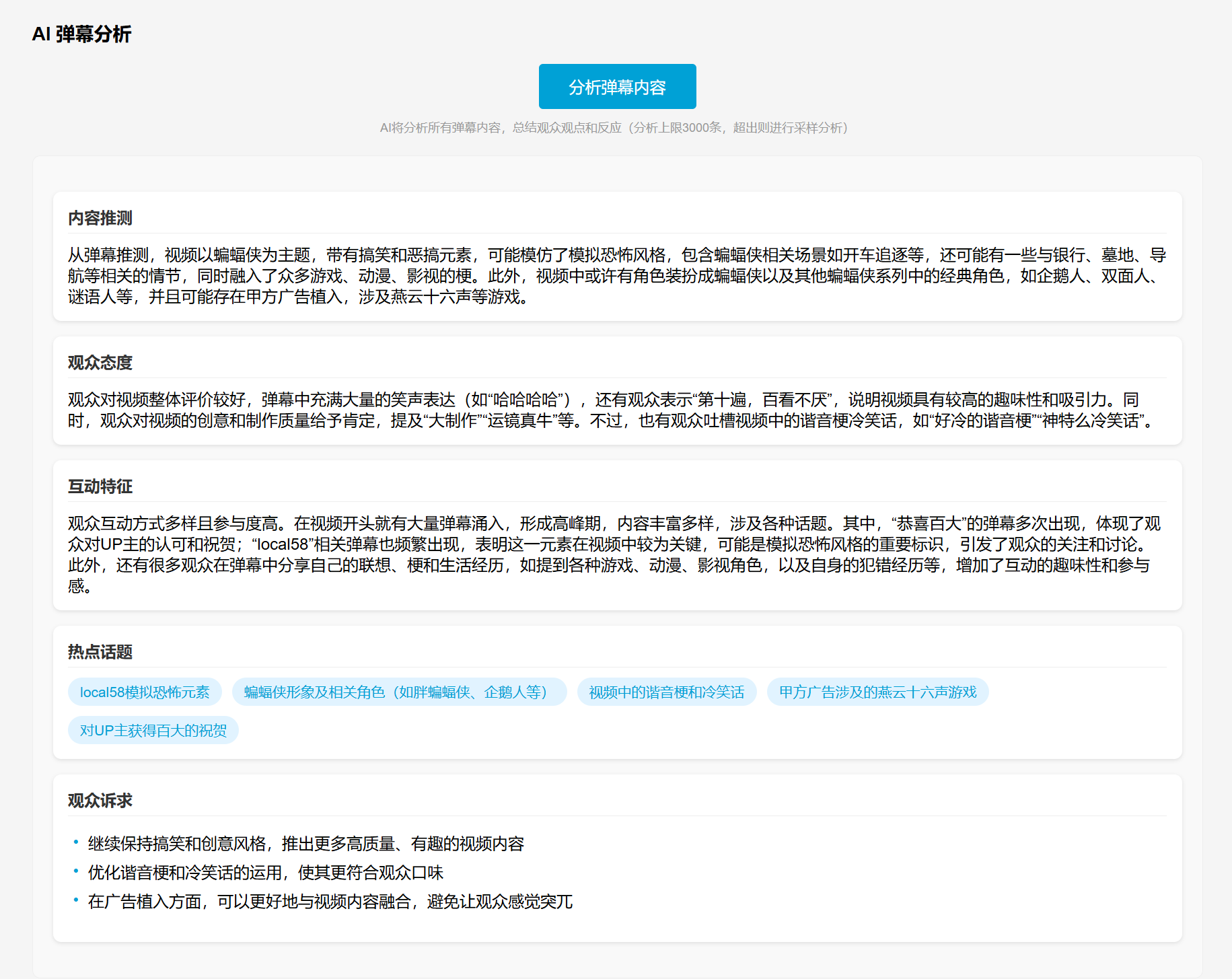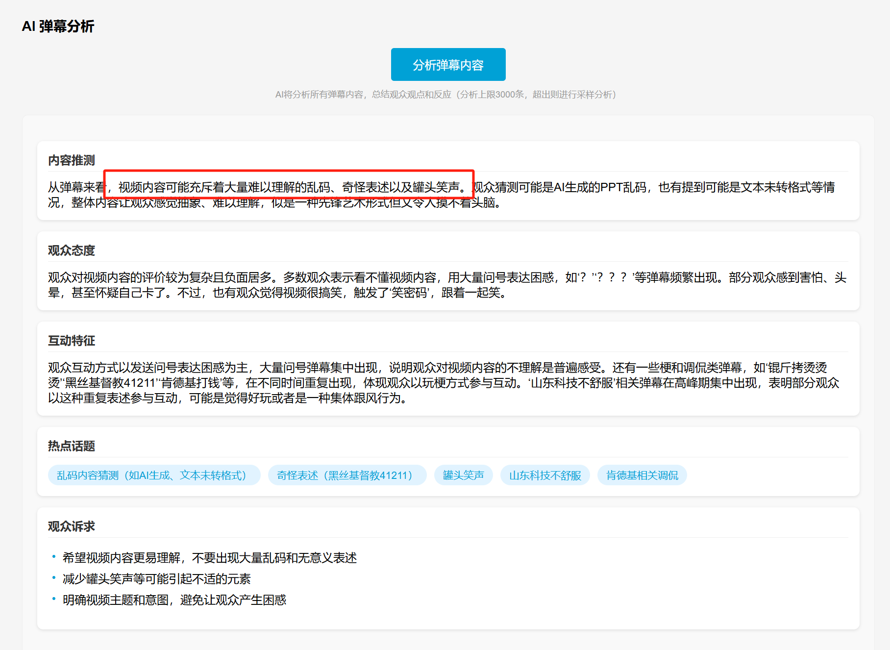 AI弹幕分析会基于视频的基本信息和弹幕的内容,反推这个视频的内容并进行一些推论和归纳。这个还挺神奇的,要知道AI此时是没有得到视频本身内容的任何信息的,但往往凭借视频基本信息和网友弹幕,就能把视频主题推测个八九不离十,并且精准捕获视频中隐藏的甲方。