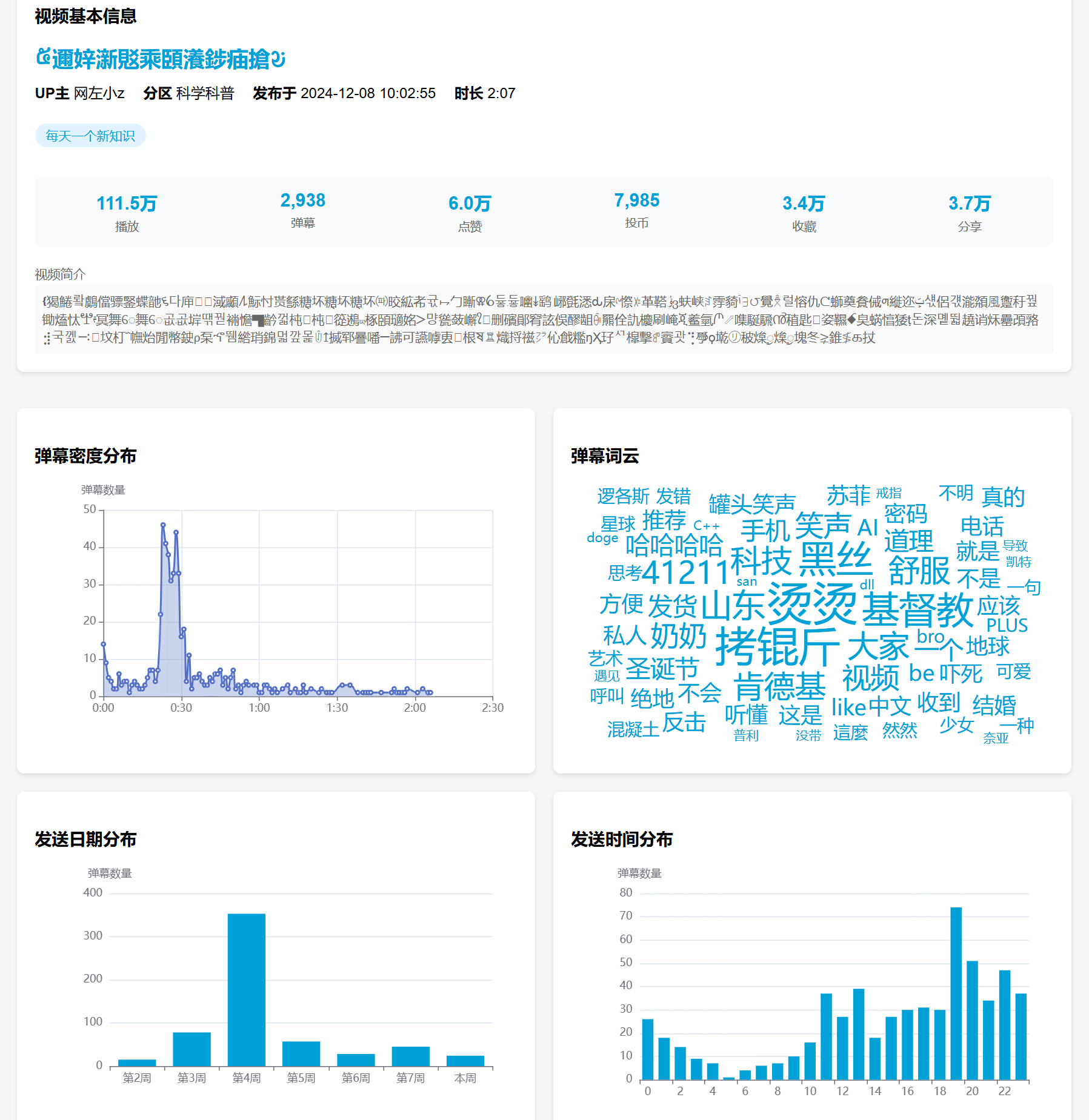 需要注意的是,由于弹幕API接口的问题,只能获取到T-1日期的弹幕,并且部分弹幕量过大的视频会存在官方清除弹幕的情况,此时弹幕的数量以及下方的发送日期分布,都会出现不准确的情况。