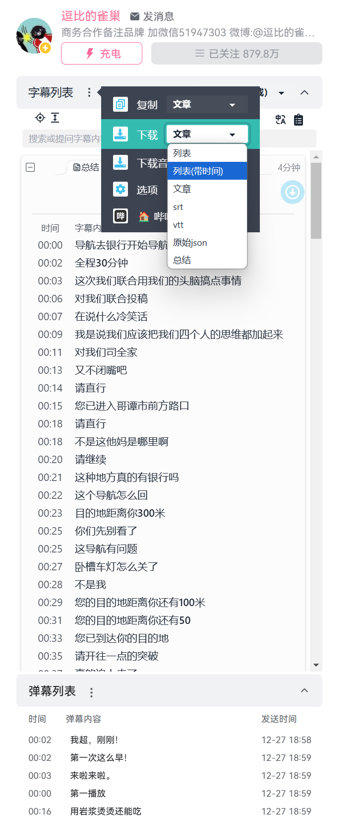 现在我们想要想要对视频的字幕和弹幕进行交叉分析,那最好字幕也要带有时间码,所以选择“列表(带时间)”格式进行下载,就可以得到一个带有时间码的TXT字幕文件。