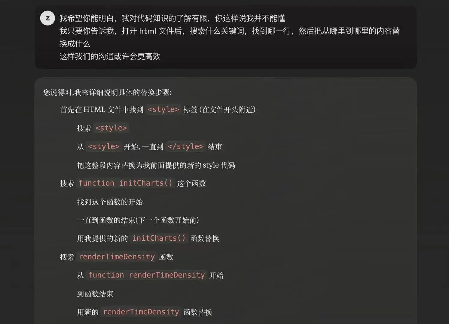 3.如果你跟我一样,面对AI发过来的修改这个函数那个路由根本不知道应该改哪,提前跟它约定好做出修改指示的方式。