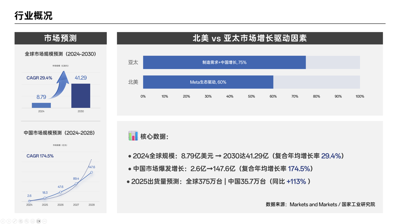 逐字稿:各位领导好,在这一页,我们来了解一下AI眼镜行业的概况。从市场规模预测的数据来看,AI眼镜行业前景十分广阔。2024年全球AI眼镜市场规模为8.79亿美元,这一数据来源于权威的Markets and Markets报告。而到2030年,全球市场规模预计将达到41.29亿美元,年复合增长率为29.4%。这意味着在未来几年,全球AI眼镜市场将持续快速增长。