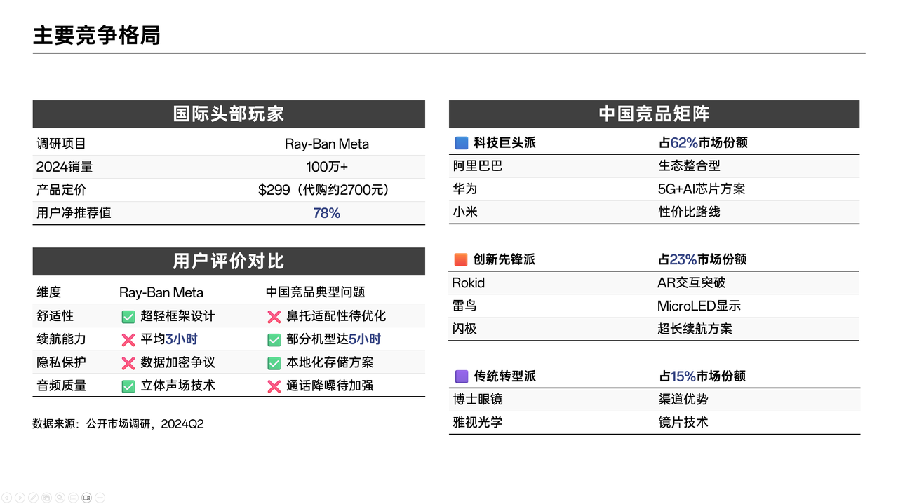 总体而言,国际头部玩家Ray – Ban Meta在市场上已取得一定成绩,但也存在一些有待改进的地方。而中国的竞品矩阵,各类型厂商凭借自身不同的优势,积极参与市场竞争,整个行业呈现出蓬勃发展的态势。 数据来源:公开市场调研,2024Q2。