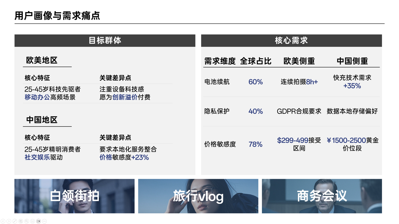 逐字稿:这一页主要聚焦AI拍摄眼镜的用户画像与需求痛点。先来看目标群体。欧美地区的目标群体,集中在北美和欧洲都市,年龄在25到45岁之间,多为白领以及技术爱好者。这部分人群热衷于追求科技潮流,对新技术接受度极高,他们日常的工作和生活场景丰富多样,对智能设备的需求自然也比较高,他们就像是科技领域的先驱者,工作中高频的移动办公场景,让他们对智能设备的依赖程度不断增加,同时,他们注重设备所展现出的科技感,并且愿意为创新功能支付更高的价格。