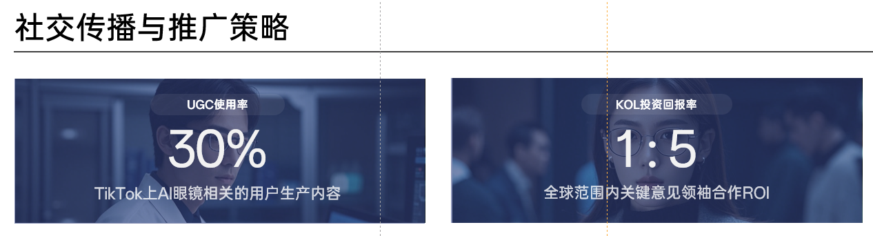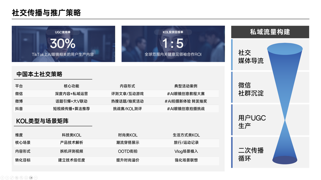 逐字稿:在全球范围内,社交媒体如TikTok上AI眼镜相关UGC,也就是用户生成内容的使用率约30%,而KOL,即关键意见领袖合作的ROI,也就是投资回报率可达1:5 ,这充分显示出社交媒体在AI眼镜推广方面的强大传播潜力。而在中国市场,社交媒体生态更为丰富多样,各平台也有着独特的用户群体和传播特点,为我们这款AI拍摄眼镜的推广提供了广阔空间。接下来,我们详细看看针对中国本土的社交传播与推广策略。