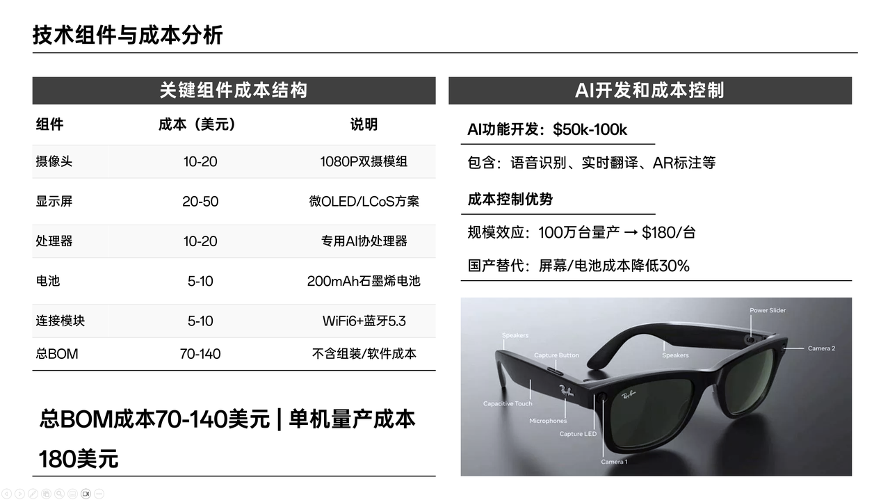 逐字稿:接下来为大家介绍的是这款AI拍摄眼镜的技术组件与成本分析。