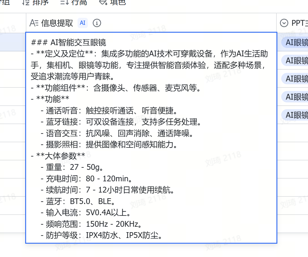 值得一提的是,AI识图字段也是能够直接输入文本的哦。上一步Deep Reaserch到的文字报告,可以直接粘贴到「信息提取」这个字段,也会作为资料信息被整理。