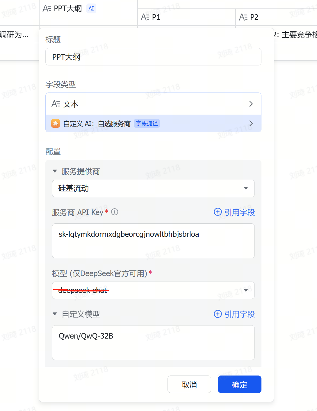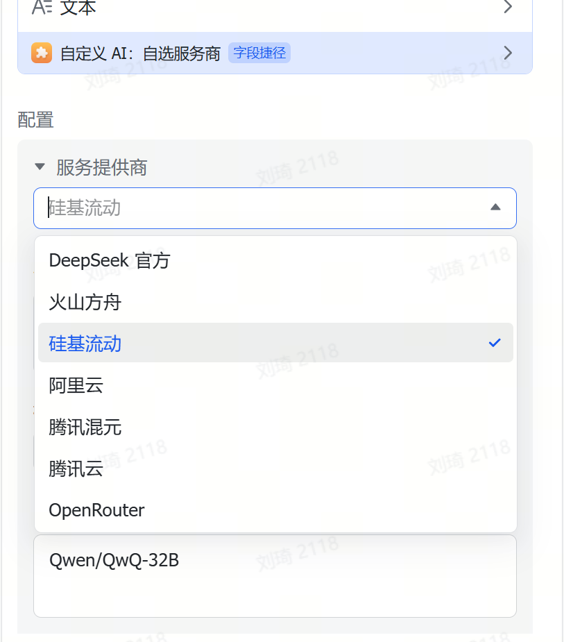 由于参考资料的输入量通常会很大,所以很容易超出多维表格默认的几个傻瓜式字段捷径的上下文限制。这里我使用了自定义AI的字段捷径,需要到API服务商处手动注册获取API。