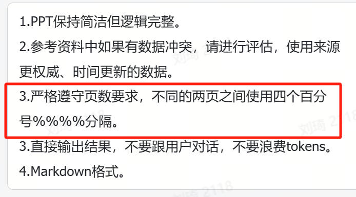 生成大纲的时候我有通过提示词进行约束,PPT不同页之间会使用四个%分隔,我们可以通过这个标记来进行分页拆分。