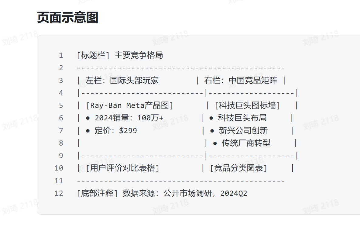 逐字稿:在这一页,我们来深入分析AI拍摄眼镜领域的主要竞争格局。主要从国际头部玩家Ray – Ban Meta,以及中国竞品矩阵两大方面展开。