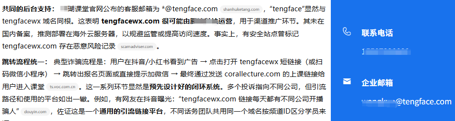 而前文提到的几个不同域名 tengfacewx.com / shanhuclass.com / corallecture.cn,表面上是不同网站,备案公司主体也各异。但在AI深度分析下,还是挖出了它们之间存在的隐秘联系。
